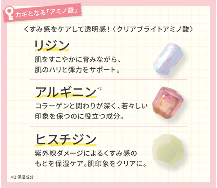 肌が不安定だと、乾燥などにより肌がくすんで見える原因に。シミのもとになるメラニンは「L-アスコルビン酸2-グルコシド」でケアし、「クリアブライトアミノ酸」でしっかりうるおいを与えることで明るい肌印象へ導きます。
