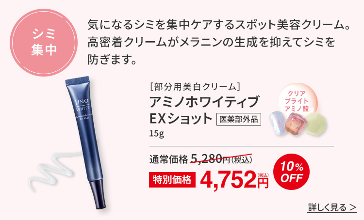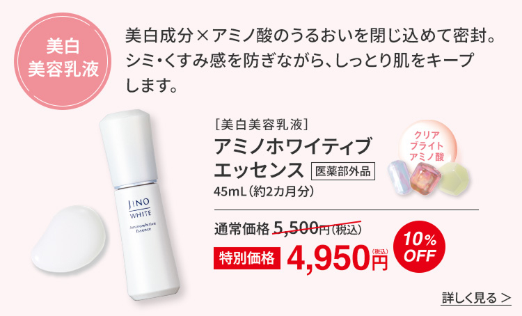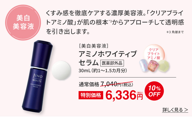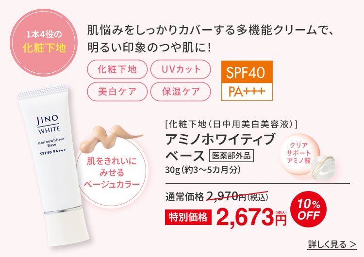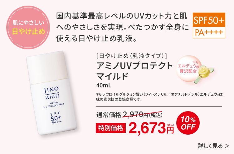 紫外線は“ゆらぎ肌”の原因の1つ。「ジーノ」のUVアイテムなら肌へのやさしさと紫外線カット力を両立しているのでおすすめです。さらに「クリアサポートアミノ酸」が日中の美白ケアをサポートし、くすみ感もケアします。