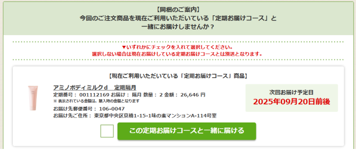 一緒にお届けをご希望の定期お届け商品の「この定期お届けコースと一緒に届ける」にチェックを入れて、