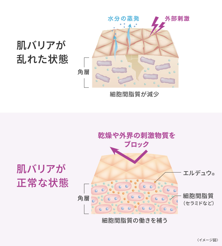 独自のアミノ酸系バリア成分 エルデュウ®*1がうるおいを閉じ込め、 乾燥・肌荒れを防ぎます。 年齢とともに減少する角層細胞間脂質のひとつであるセラミドと似た働きをすることで、バリア機能をサポート。乾燥や外界の刺激物質をブロックし、健やかな肌を保ちます。 *1 ラウロイルグルタミン酸ジ(フィトステリル/オクチルドデシル)(保湿成分)