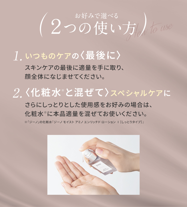 さらにしっとりとした使用感をお好みの場合は、化粧水※に本品適量を混ぜてお使いください。 ※「ジーノ」の化粧水『ジーノ モイスト アミノ エンリッチド ローションⅠ[しっとりタイプ]』をおすすめします。