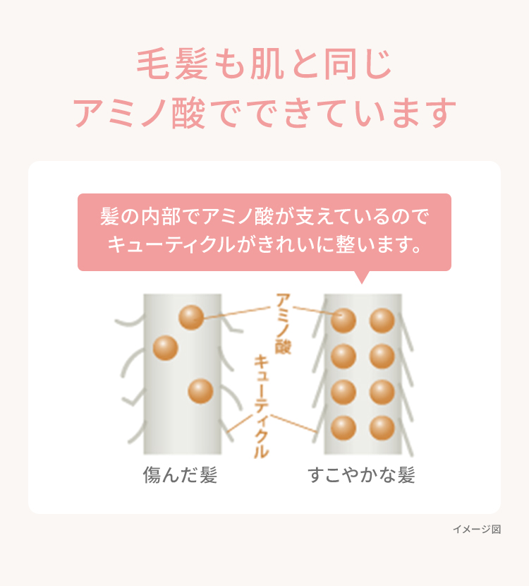 髪は沢山のアミノ酸でできていて、こだわりのアミノ酸が、髪のダメージをしっかり補修し、パサつきを抑えます。