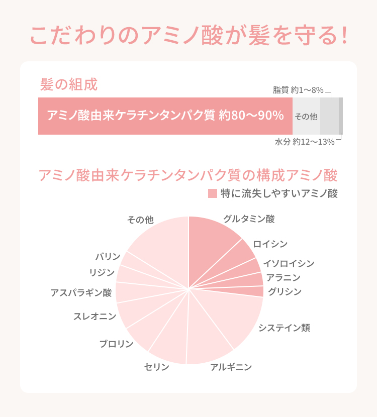 アミノ酸は毛髪の約80%を占めるタンパク質の主成分。ダメージを受けた髪はアミノ酸が流出しやすくなっています。