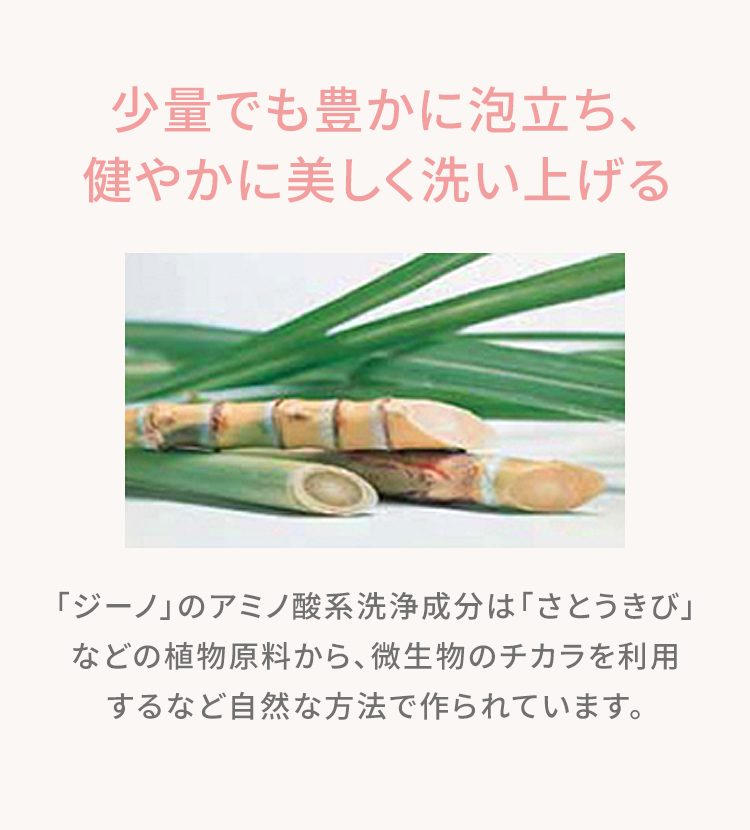 「ジーノ」のアミノ酸系洗浄成分は「さとうきび」などの植物原料から、微生物のチカラを利用するなど自然な方法で作られています。