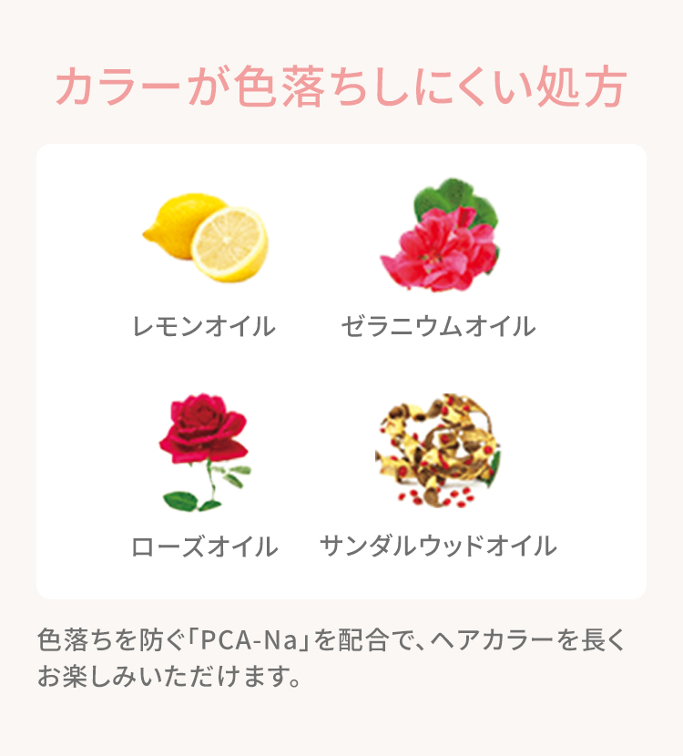 色落ちを防ぐ「PCA-Na」を配合で、ヘアカラーを長くお楽しみいただけます。