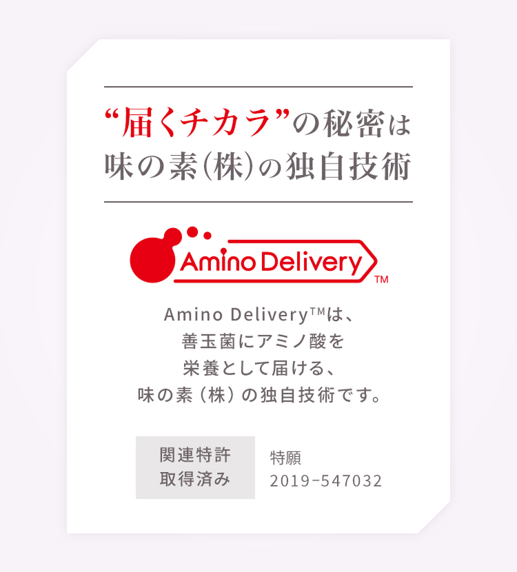 “届くチカラ”を支えているのが、アミノ酸研究のスペシャリストである味の素(株)の独自技術「Amino Delivery™」。善玉菌にアミノ酸を栄養として効率よく届けるために開発されて関連特許を取得しています。(特願2019-547032)
