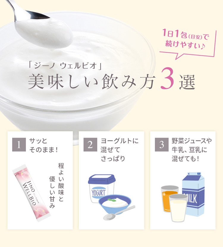 ・ヨーグルトの栄養をさらにリッチにしたい! ・美容成分と善玉菌の栄養をまとめてとりたい… ・食生活が乱れがち… 朝からスッキリおいしくスタートしたい そんなお悩みにスキンケアブランド「ジーノ」から新提案。“届いて・育んで・うるおう”美しさを支える成分をひとまとめにしたインナーケア「ジーノ ウェルビオ」が誕生しました。