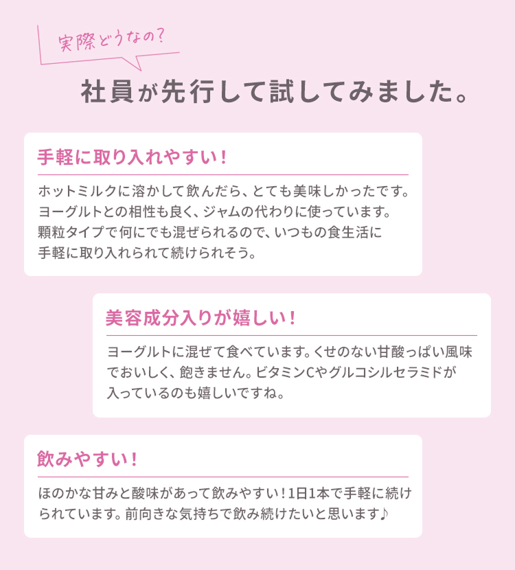 大腸の善玉菌まで届き・育む ● 1000億個の乳酸菌を配合 ● 小腸で吸収されにくいオリゴ糖& 熱や酸に強いポリグルタミン酸を独自配合 美容もサポート うるおいケア ● 成人の1日推奨摂取量(100mg)のビタミンC ● セラミドで輝く美しさもサポート