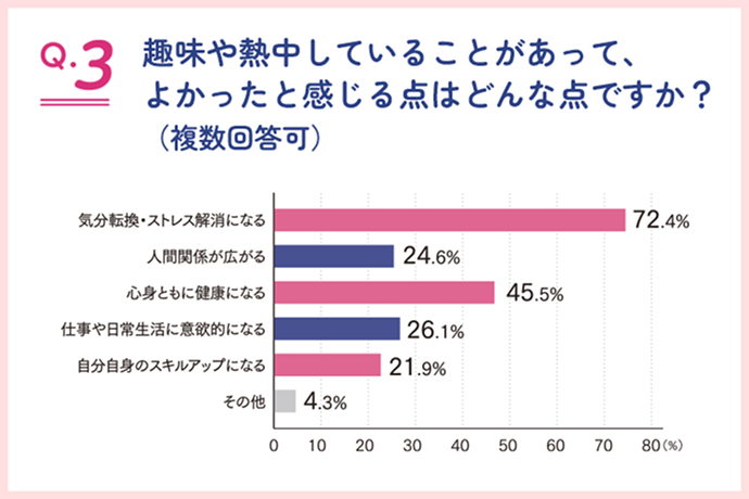 気分転換やストレス解消では、「リセットできる」「没頭できる」という声がありました。また、「趣味を通じて友達ができた」といったコミュニケーションの広がりや、「時間を有効活用できるようになった」「体調を管理するようになった」など生活面でのプラスの声も。