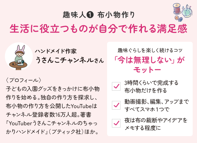 作ったものを記録に残したくてYou Tubeを始めました。動画制作はスマホ一つで完結。布小物作りもSNSも短時間でできることをコツコツ積み重ねるようにしています。