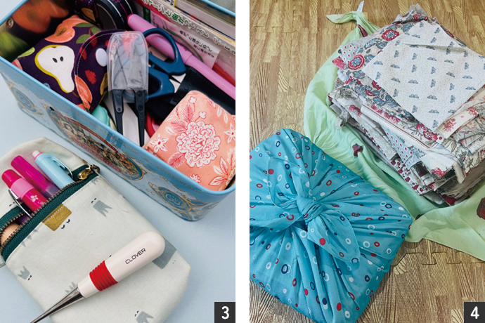 3)手芸道具入れはクッキー缶。細長い道具は縦型ポーチに。