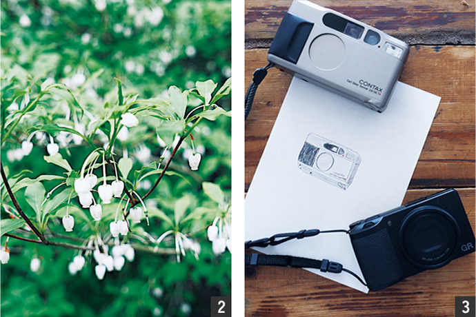 3)大学合格時に父からもらったCONTAXのカメラはイラストにも描いている。右下は愛用のGRシリーズ。