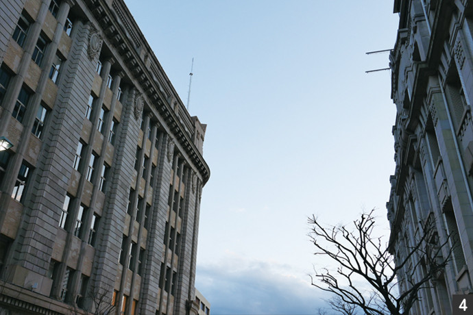 4)近代建築が並ぶ神戸市内の旧居留地は大好きな場所。神戸育ちでも外国気分になれる。右側のビルは再建されたが、左側は大正時代からこの場所にある美しい建物。