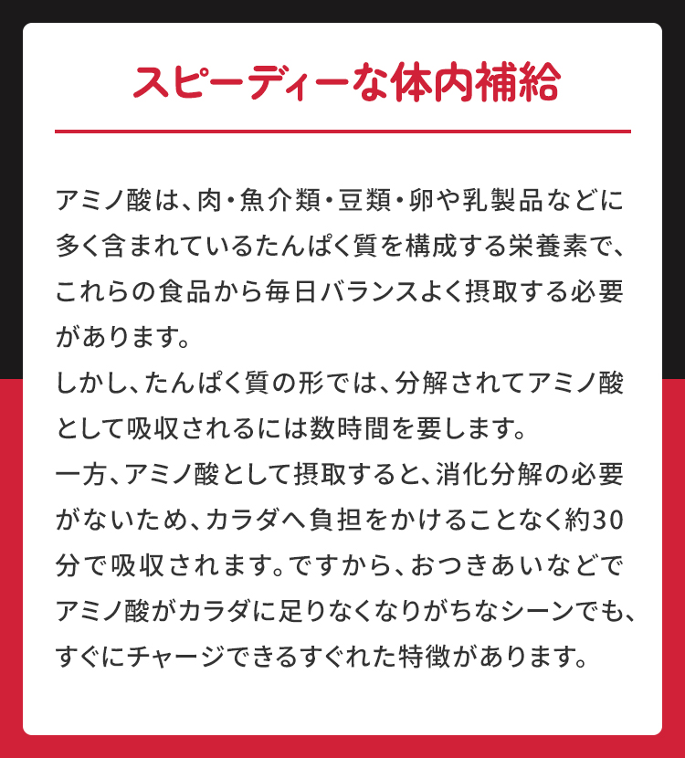 アミノ酸は、肉・魚介類・豆類・卵や乳製品などに多く含まれているたんぱく質を構成する栄養素で、これらの食品から毎日バランスよく摂取する必要があります。 しかし、たんぱく質の形では、分解されてアミノ酸として吸収されるには数時間を要します。 一方、アミノ酸として摂取すると、消化分解の必要がないため、カラダへ負担をかけることなく約30分で吸収されます。ですから、おつきあいなどでアミノ酸がカラダに足りなくなりがちなシーンでも、すぐにチャージできるすぐれた特徴があります。