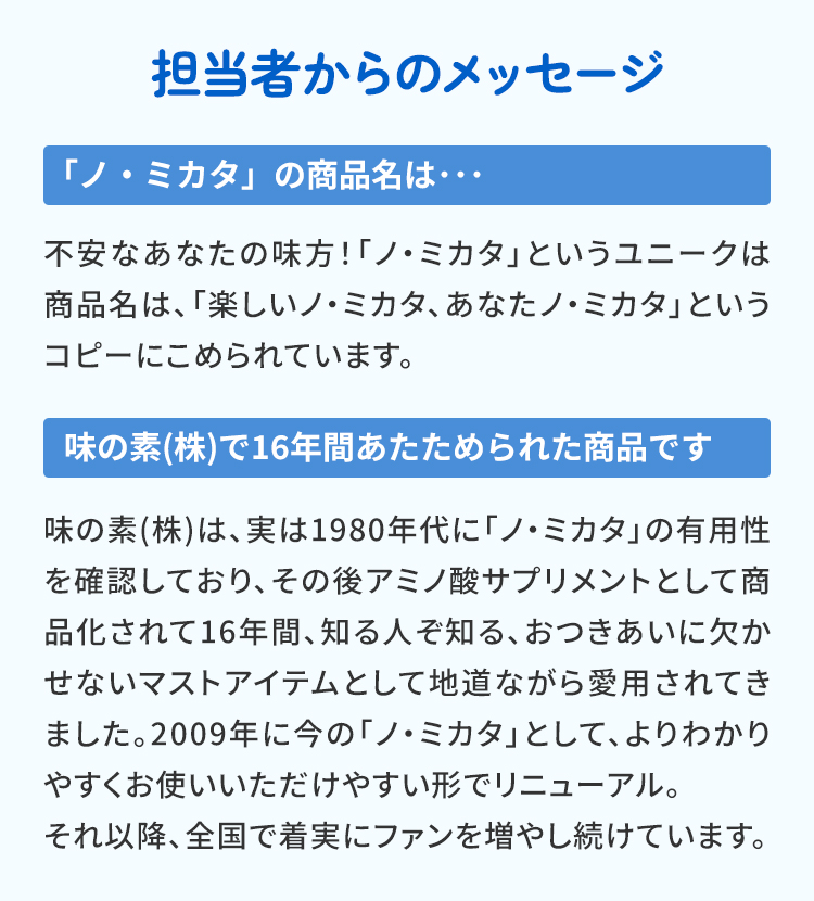 満足する体感と実用性を備えたアミノ酸サプリメント 味の素(株)は、実は1980年代に「ノ・ミカタ」の有用性を確認しており、その後アミノ酸サプリメントとして商品化されて16年間、知る人ぞ知る、おつきあいに欠かせないマストアイテムとして地道ながら愛用されてきました。2009年に今の「ノ・ミカタ」として、よりわかりやすくお使いいただけやすい形でリニューアル。それ以降、全国で着実にファンを増やし続けています。